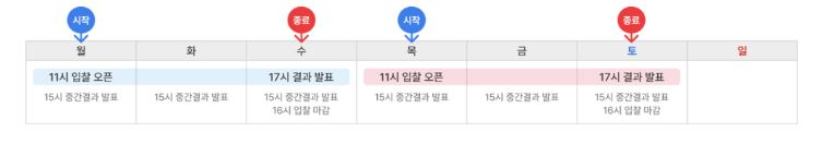 한 회차당 3일간 진행이고 매주 월요일 시작 ~ 수요일 종료, 목요일 시작 ~ 토요일 종료